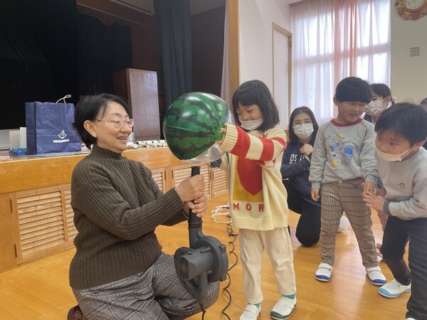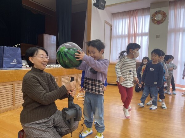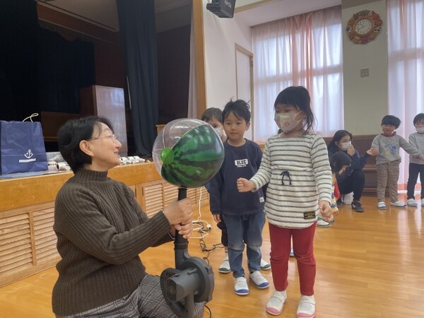昨年度に引き続き、でんじろう先生のかがくあそびをしました。今回は「かぜのちから」ということで、いろんな強さの風を使って遊んでみました。