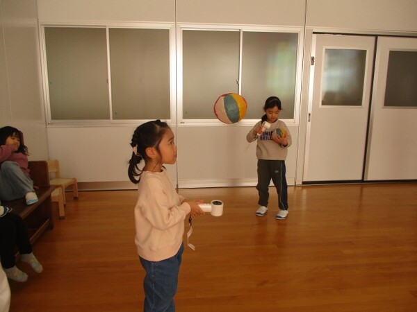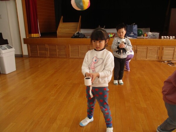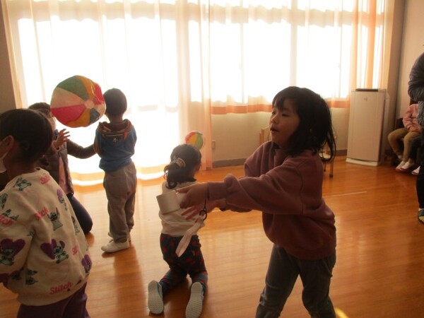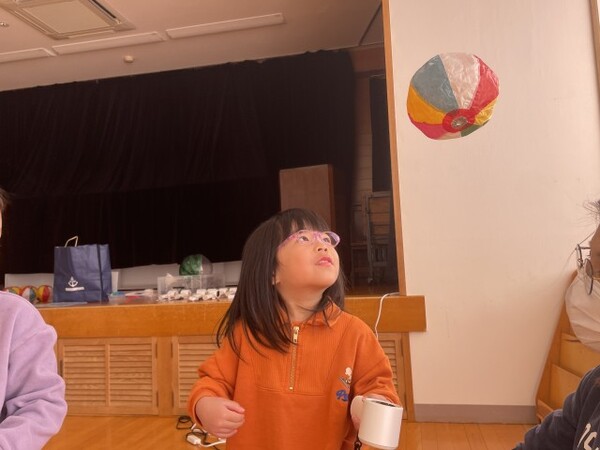 大小さまざまなかぜの力を使ったかがくあそびを楽しみました。ビーチボールを飛ばしたり、紙風船を飛ばしたり、時には自分自身に風を当てて、風(空気)を感じたりしながら楽しみました。