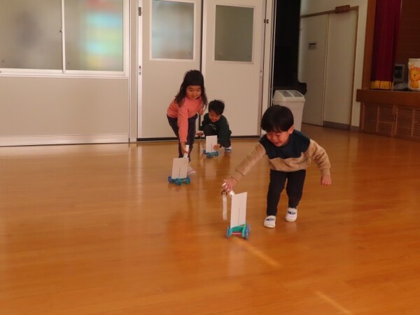 2回に渡り、かがくあそびを行いました。風を使って自分たちでミニカーを操作した子どもたちでしたが、なかなかうまく前に進まず悪戦苦闘しながらも楽しんでいる様子がありました。中には上手に前に進めることができる子どももいて、している子も見ている子もわくわく、ドキドキしている様子が伝わってきました。