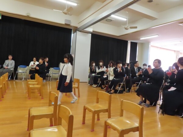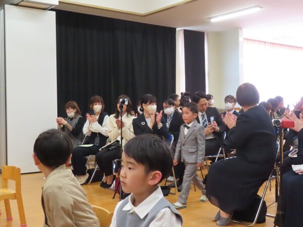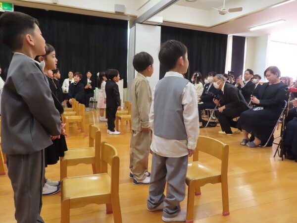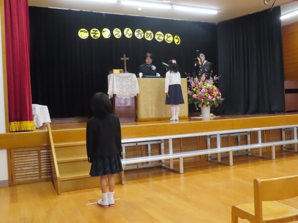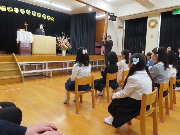 22名の子どもたちが卒園の時を迎えました。一人ひとり堂々とホールに入場をしました。ドキドキしている様子もありましたが、讃美歌を元気に歌い、卒園証書授与では名前を呼ばれた子どもたちは、一人ひとり元気に「はい」と返事をし、園長先生から証書を受け取りました。