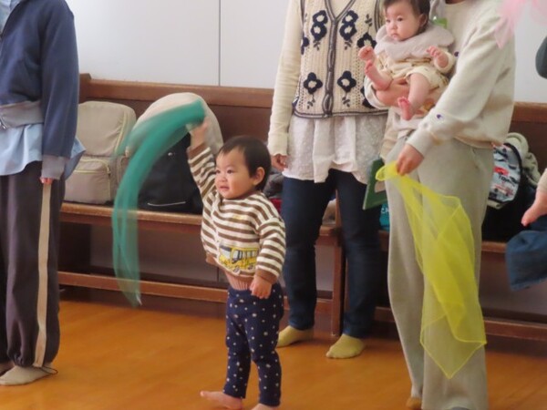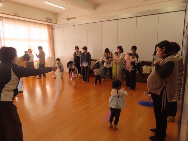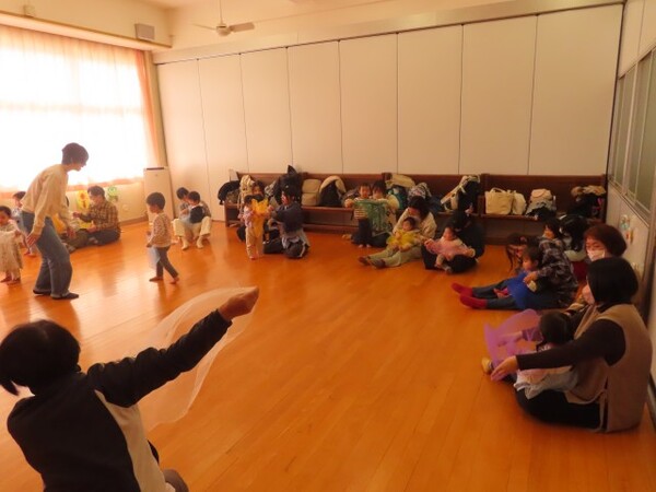 好きな遊びを楽しんだ後は、親子でわらべ歌をしました。親子でわらべ歌にあわせて触れ合ったり、布をふって楽しみました。