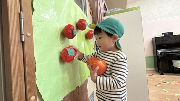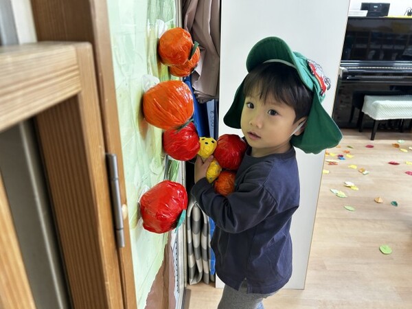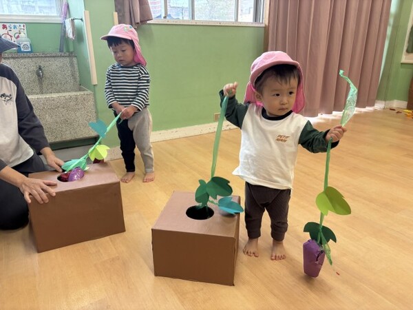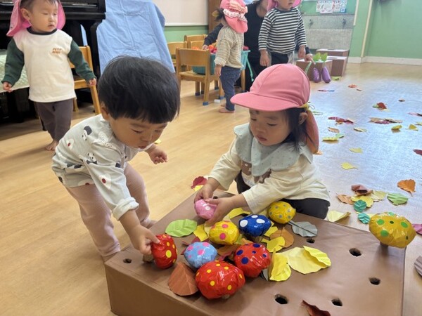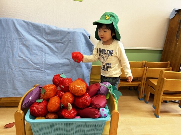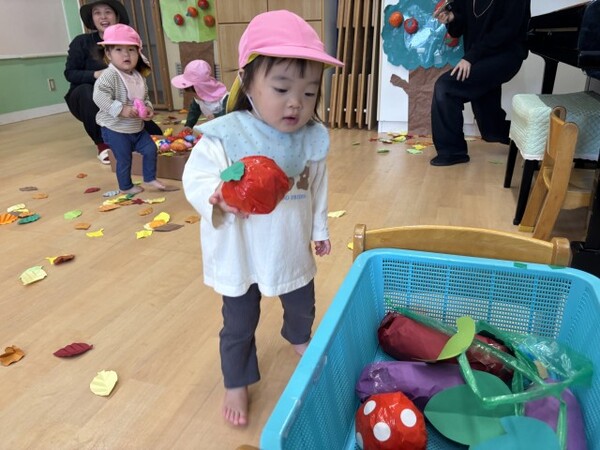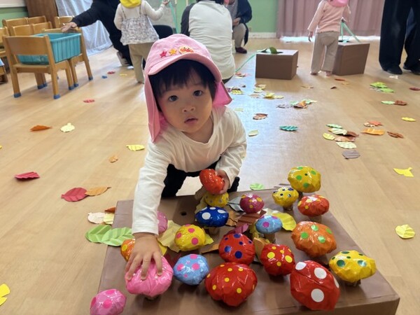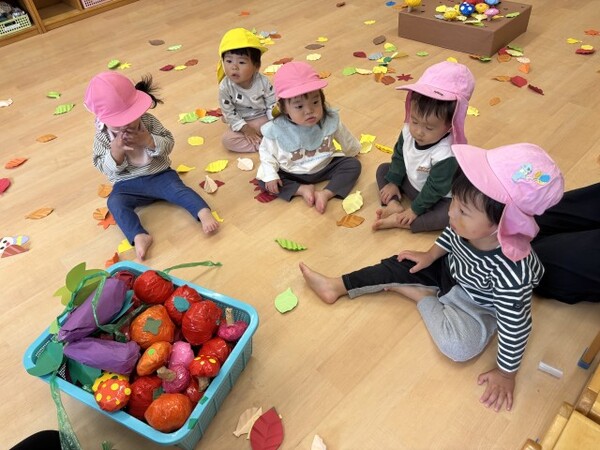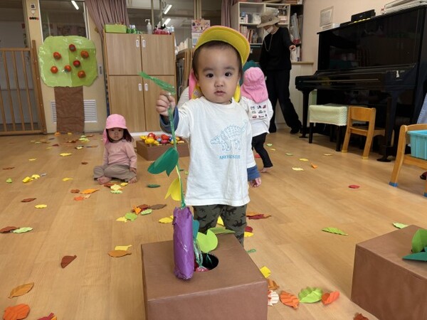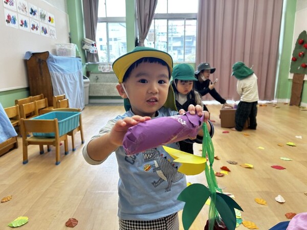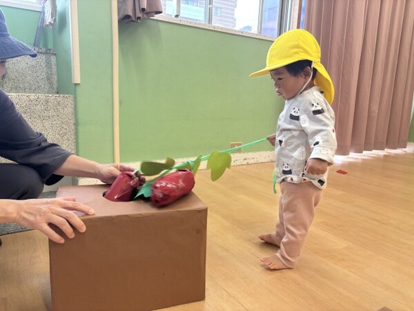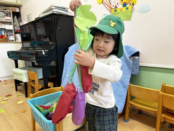未満児クラスの収穫感謝の様子です。手作りの芋やキノコ、カキなどの収穫ごっこをして遊びました。つるをひっぱると中から出てくる芋にキラキラと目を輝かせ、全部出てきた時には嬉しそうに見せたりしていました。カラフルなキノコを収穫したり、カキを木から収穫したりと秋のめぐみを感じながら収穫遊びを楽しむことができました。
