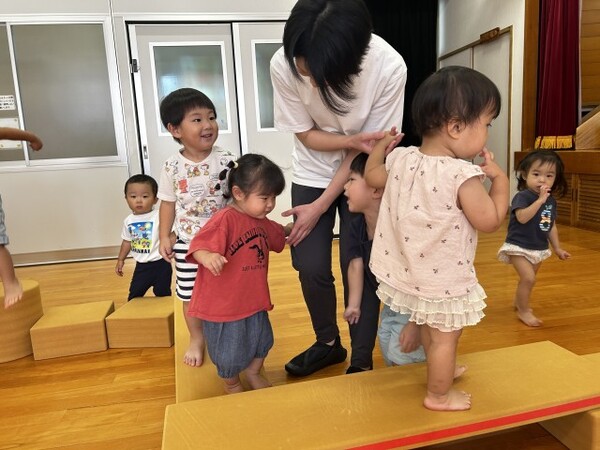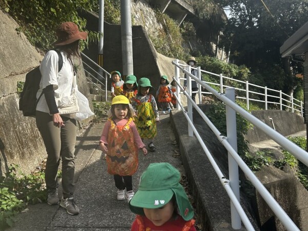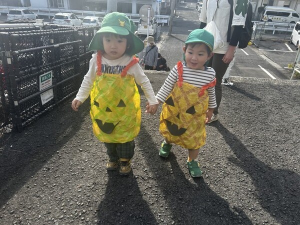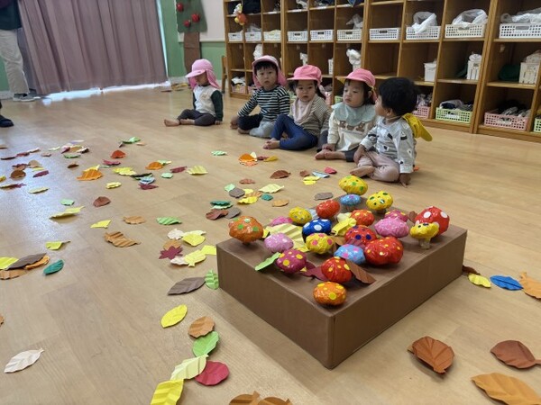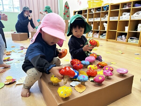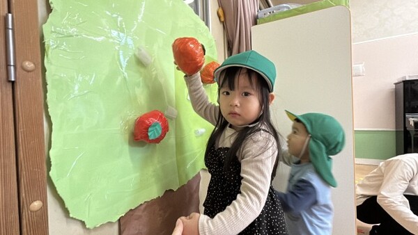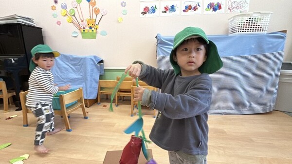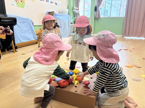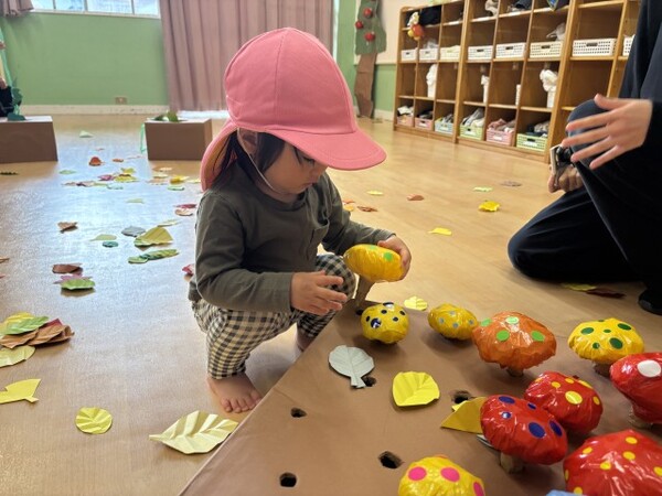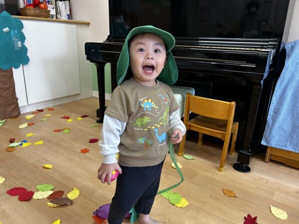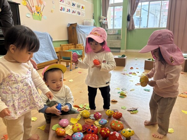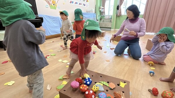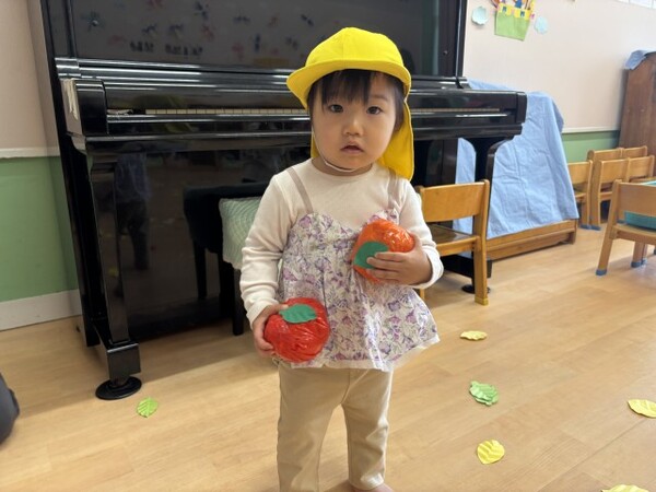未満児クラスの収穫感謝の様子です。手作りの芋やキノコ、カキなどの収穫ごっこをして遊びました。つるをひっぱると中から出てくる芋にキラキラと目を輝かせ、全部出てきた時には嬉しそうに見せたりしていました。カラフルなキノコを収穫したり、カキを木から収穫したりと秋のめぐみを感じながら収穫遊びを楽しむことができました。