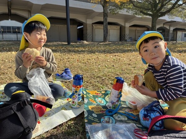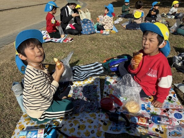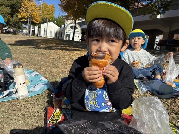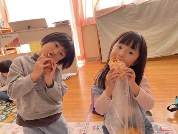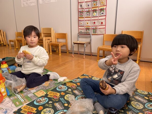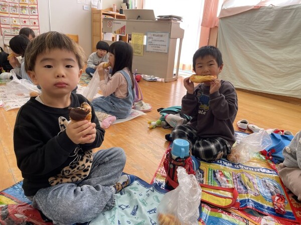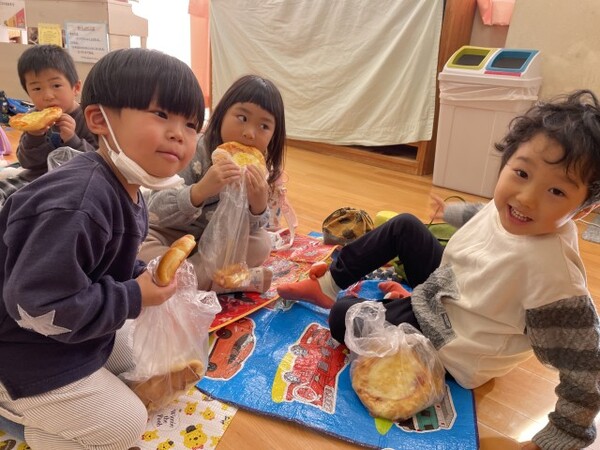 買ったパンは、園に戻って部屋でシートを敷いてピクニック気分でいただきました。みんなで食べて美味しかったね。