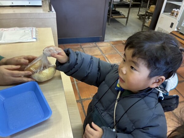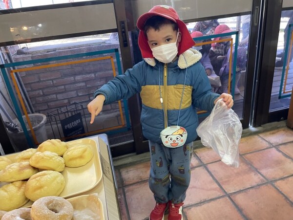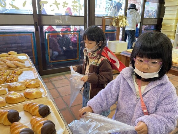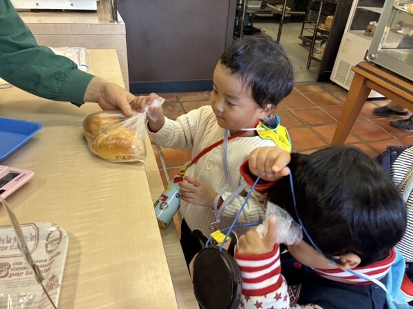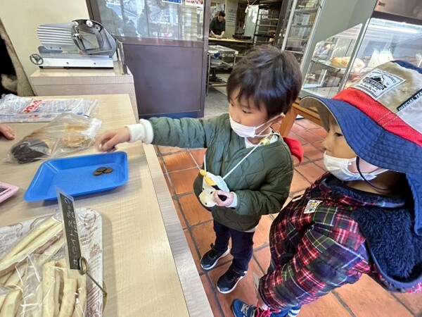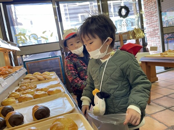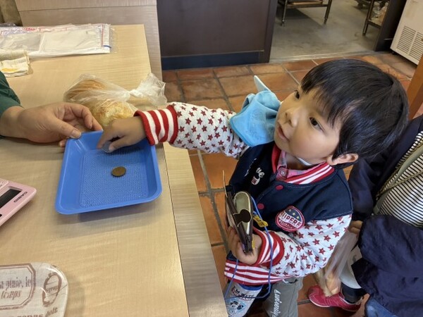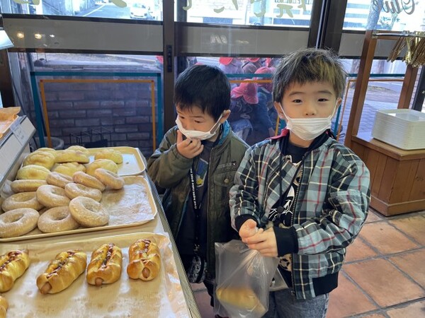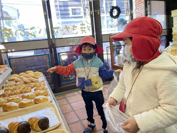 年少ぐみのパンのお買い物の様子です。園の近くのオリーブのパン屋さんにパンを買いに行きました。