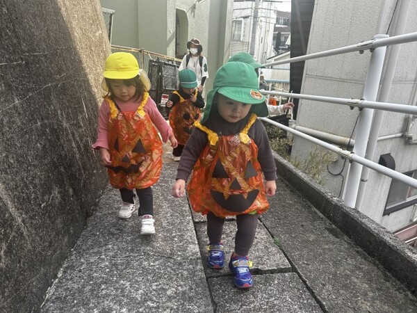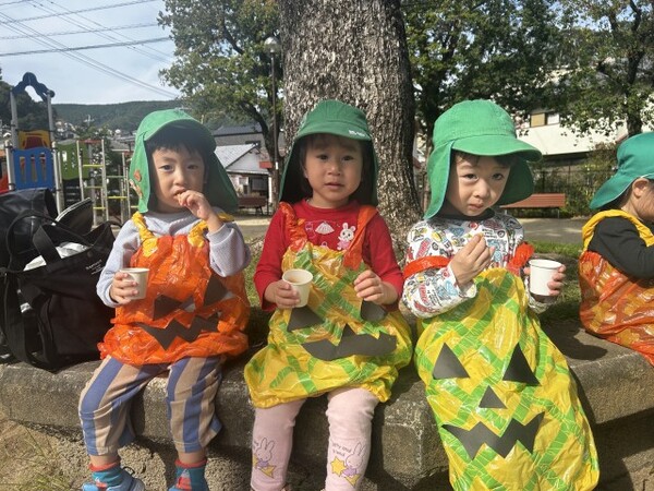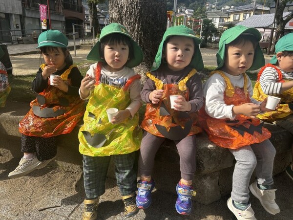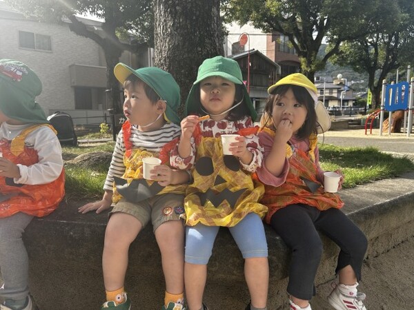 ハロウィンの衣装を着て、ハロウィンの散歩にでかけました。公園では、おやつを食べて休憩タイム! いつもと違う雰囲気の中での散歩は楽しかったようです。