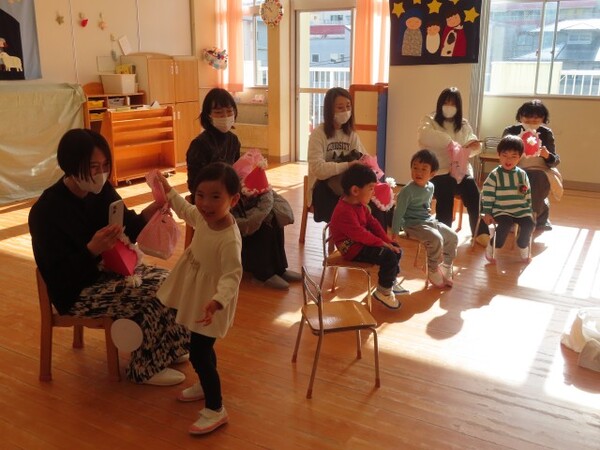 みんなで「てぶくろ」の劇を頑張りました。手袋の中に次々と入っていく動物(子ども)たち。役になりきって演じることを楽しみました。