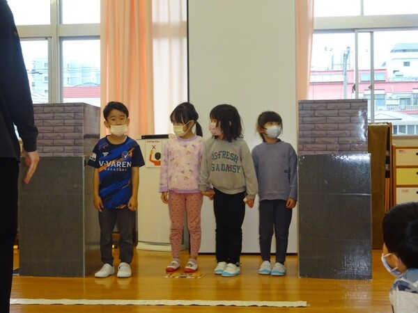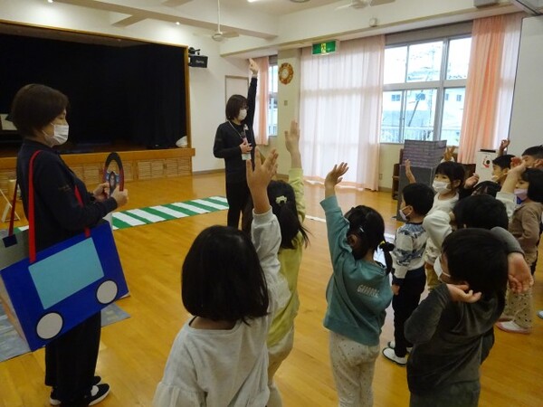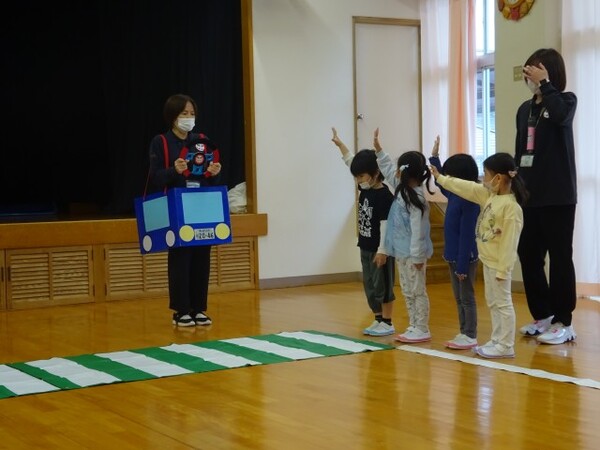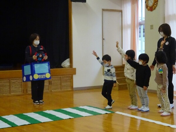 今まで学んできた交通安全のルールを振り返る時間でした。ホールを道路に見立てたり、線路に見立てたりして、実際に手を挙げてみたり、横断歩道を渡ってみたりしながら今まで学んだ安全のルールを思い出していました。