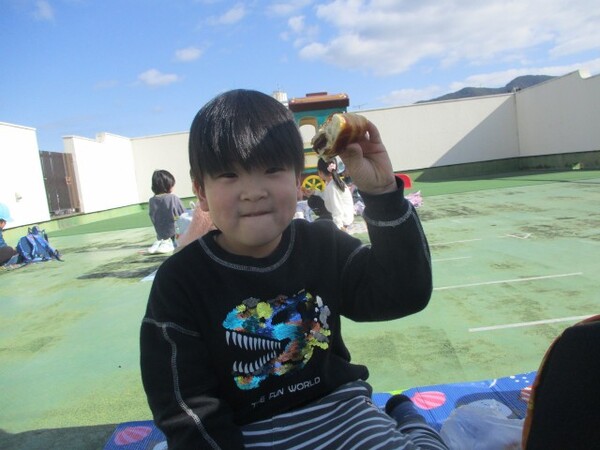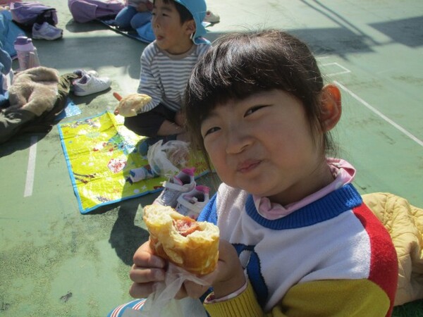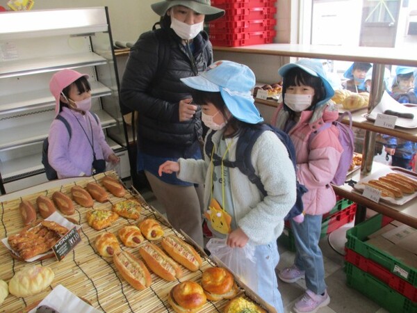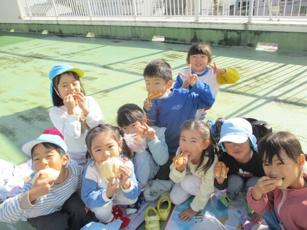 年長ぐみで園の近くのフランソアのパン屋さんにパンの買い物に行きました。迷いつつも好きなパンを2個ずつ選ぶ子どもたち。甘いパンが好きな子、総菜パンが好きな子…。それぞれの好きなパンを選ぶことができました。買ったパンは園の屋上にシートを敷いてみんなでいただきました。