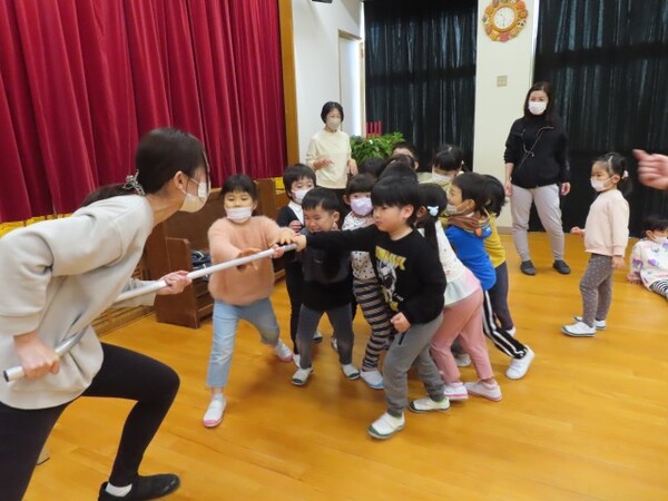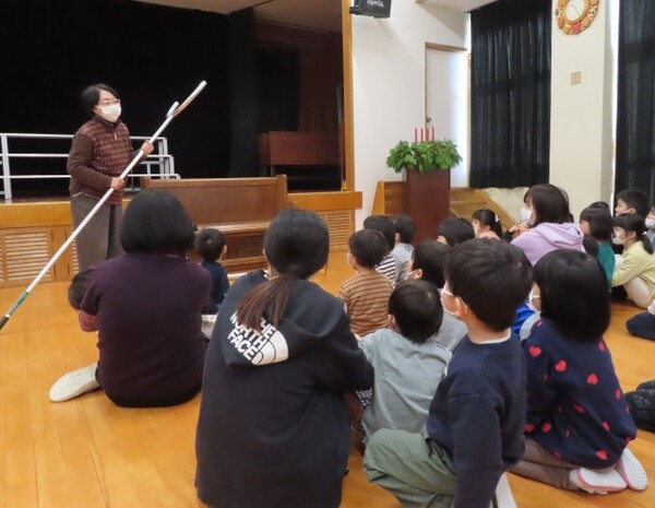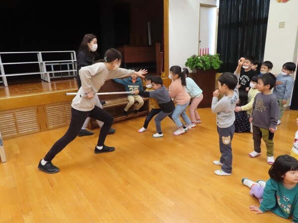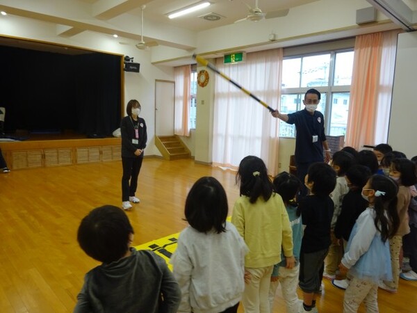 不審者を想定した避難訓練を行いました。さすまたの話を聞き、実際に先生たちが不審者役をして子どもたちがさすまたを使ってみました。