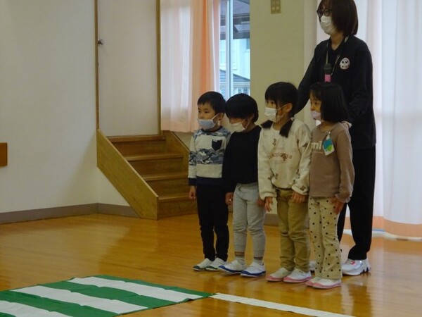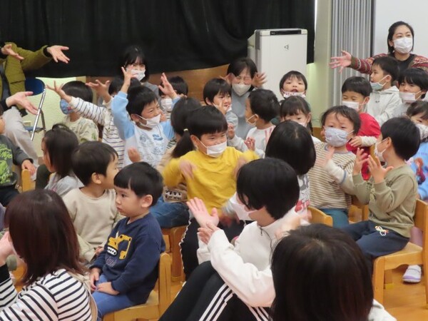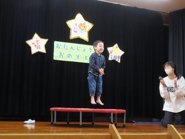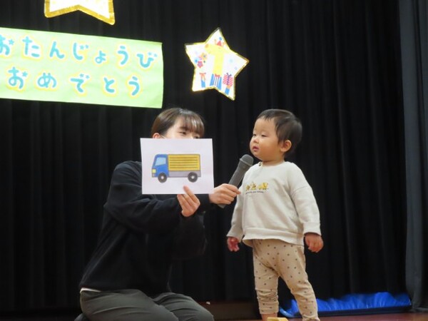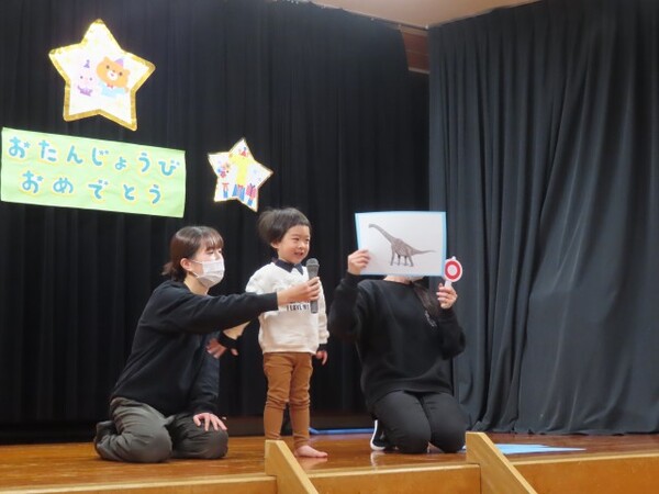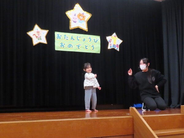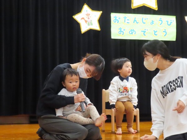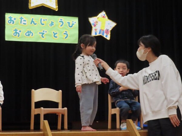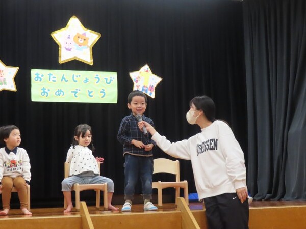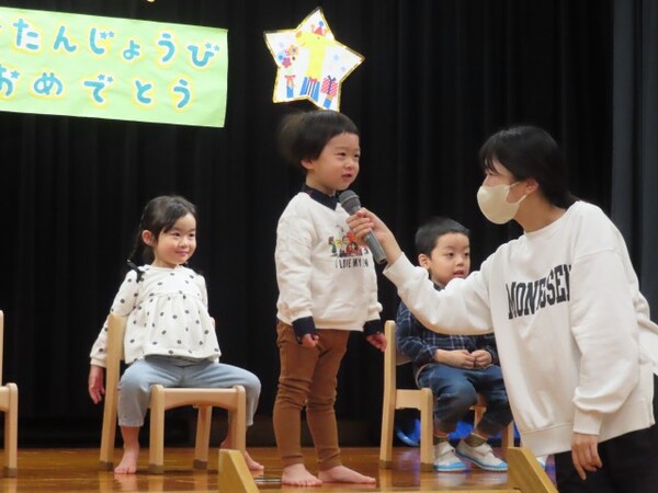 12月誕生会の様子です。誕生児は名前と年齢のインタビューを頑張りました。