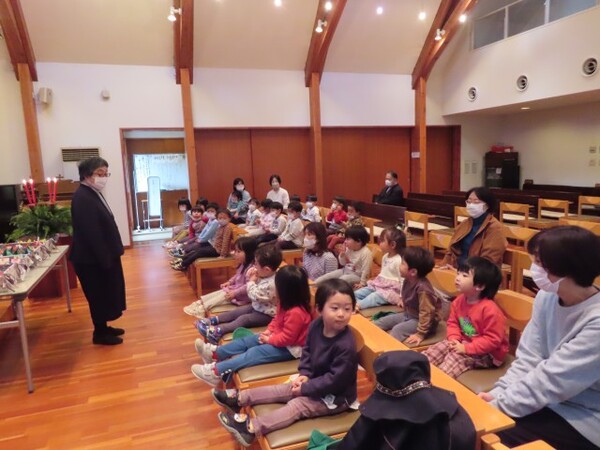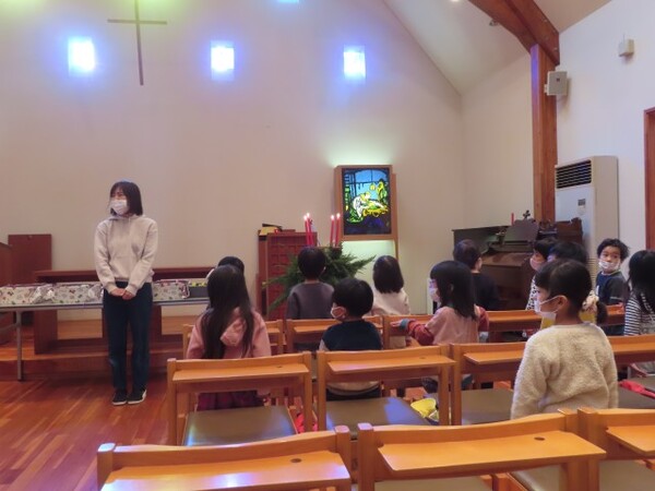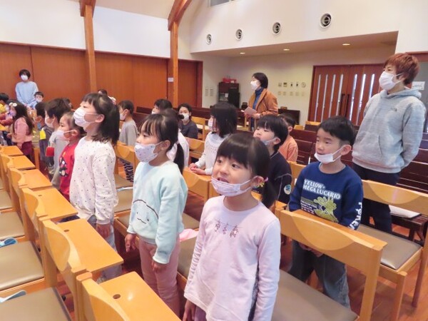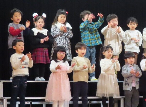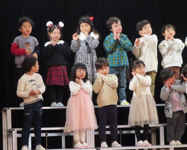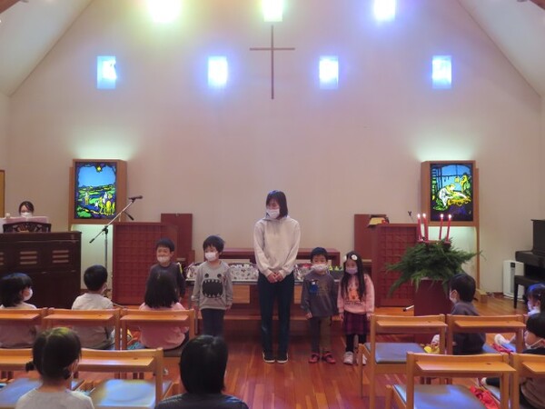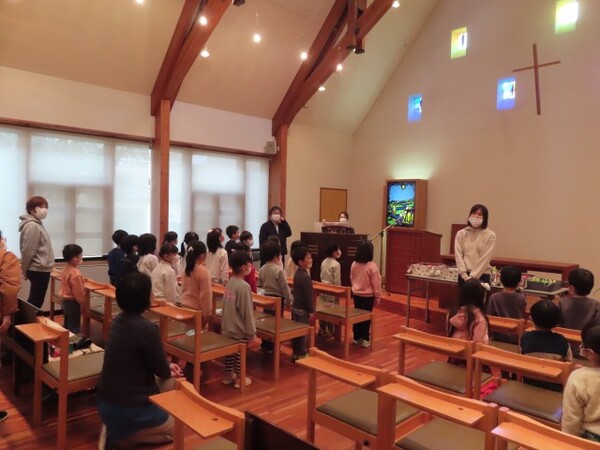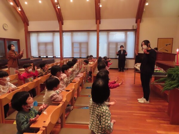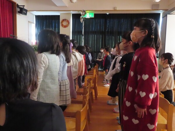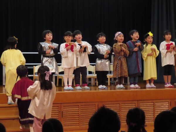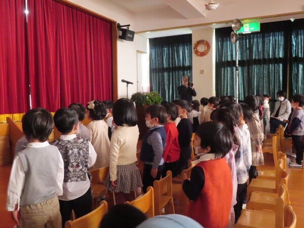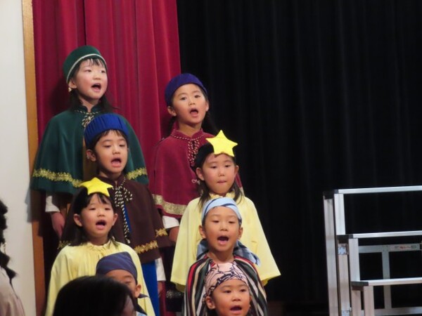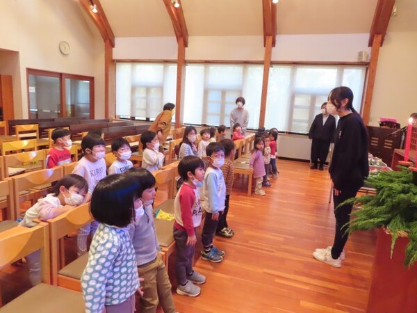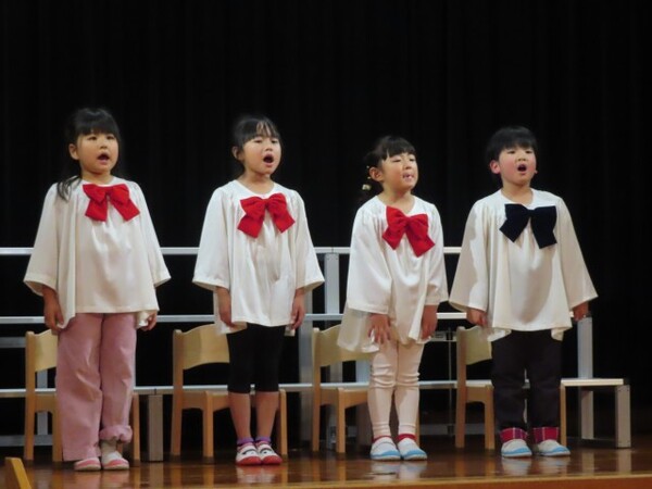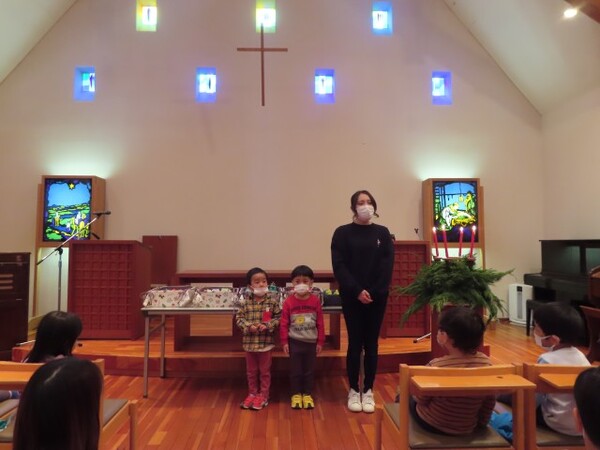 礼拝の後は、クリスマスソングの発表です。年少ぐみは『おおいそぎサンタさん』、年中ぐみは『しずかなクリスマス』を心をこめて歌いました。