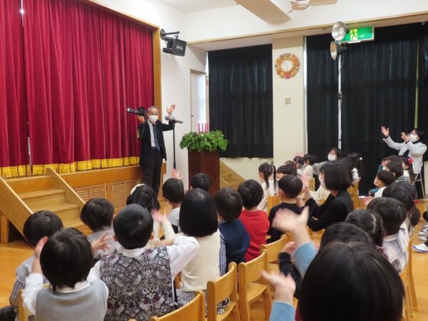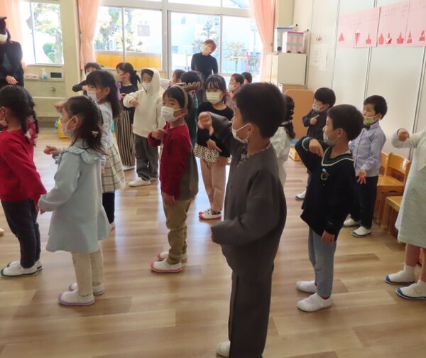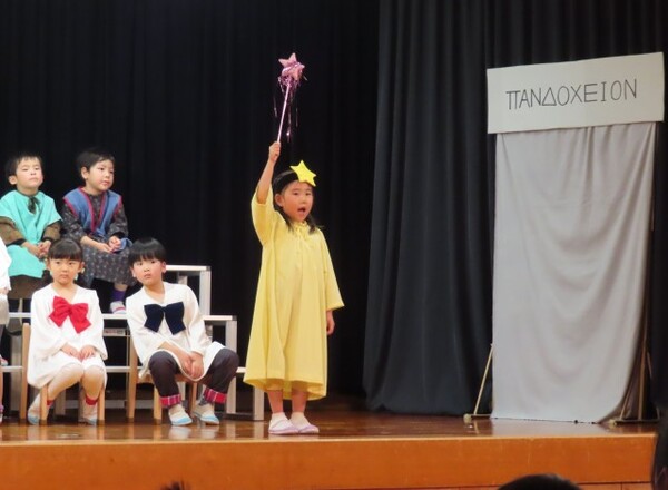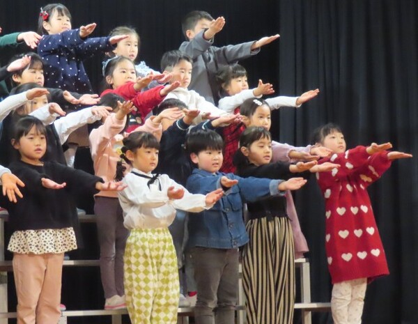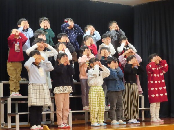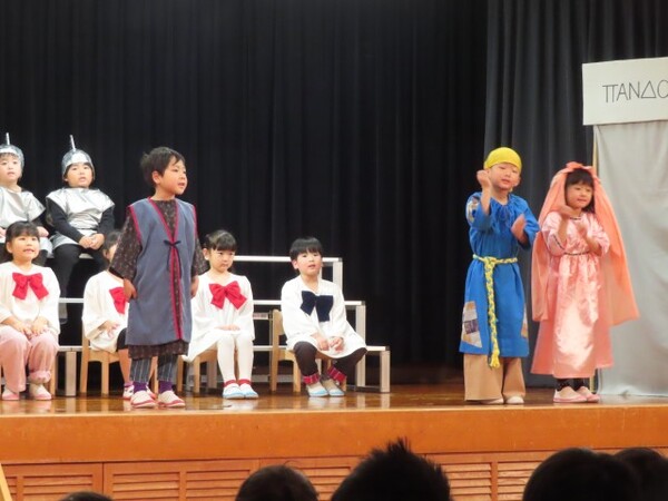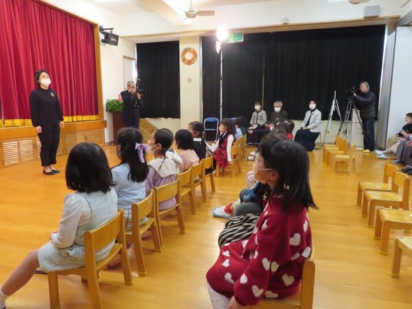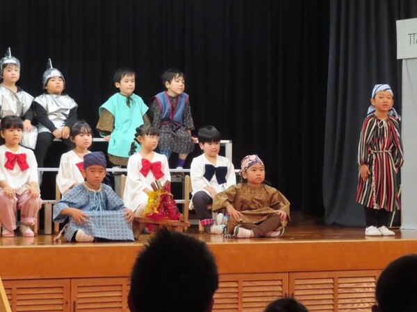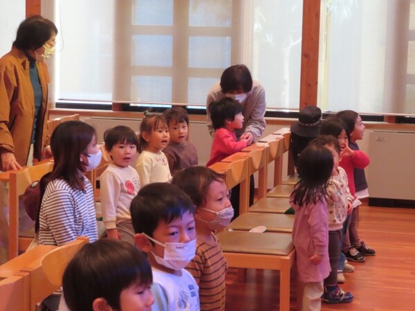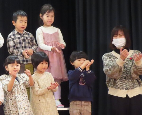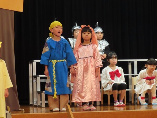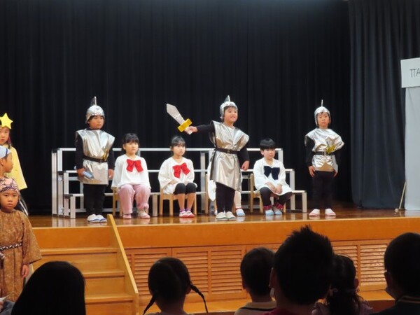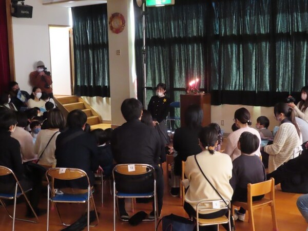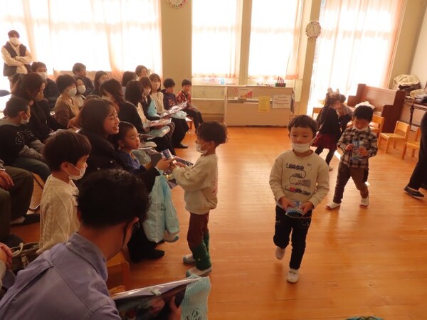 礼拝の後は、クリスマスソングの発表です。年少ぐみは『おおいそぎサンタさん』、年中ぐみは『しずかなクリスマス』を心をこめて歌いました。