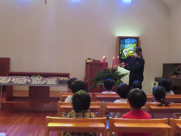 アドベントクランツの4本目のろうそくに灯りを灯し礼拝をはじめました。讃美歌を歌ったり、献金をお捧げしたり、クリスマスのお話しを聞いたりしました。