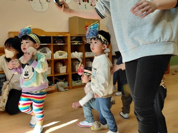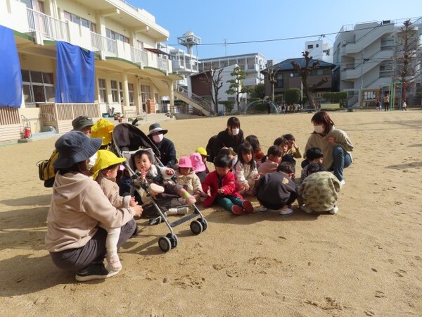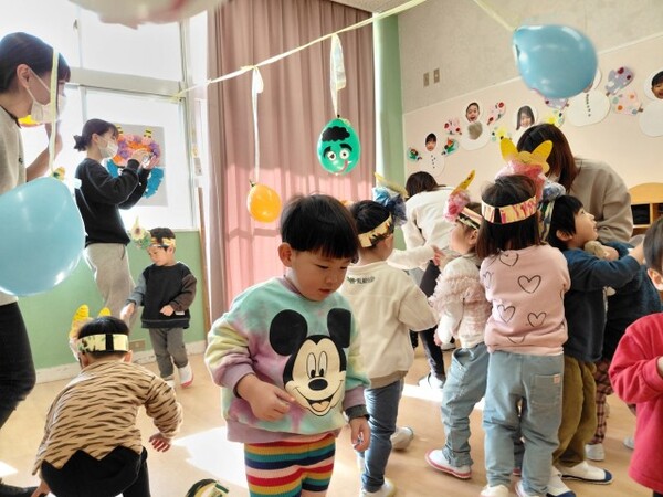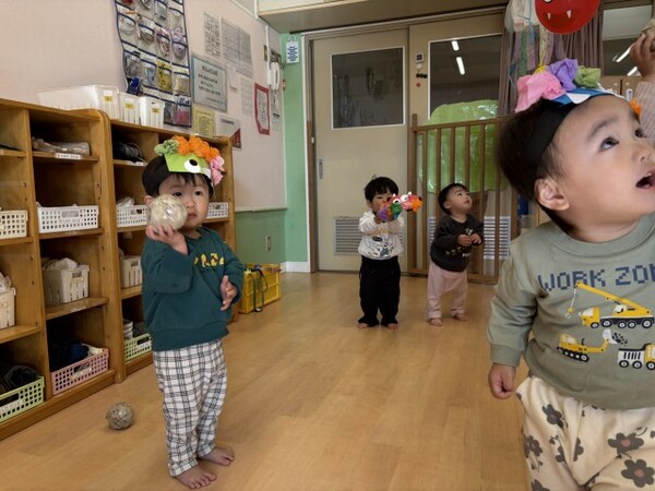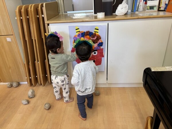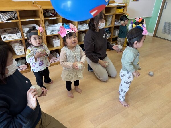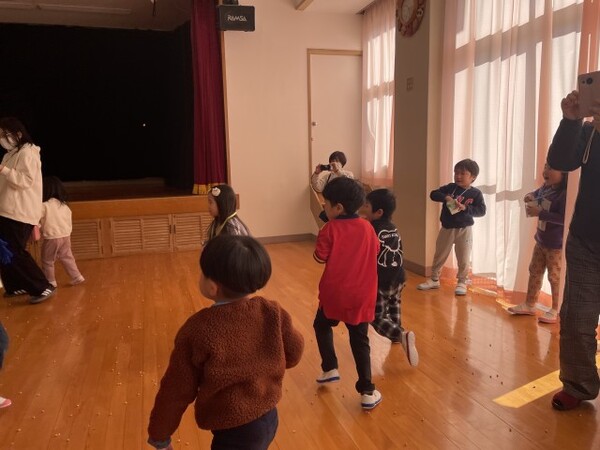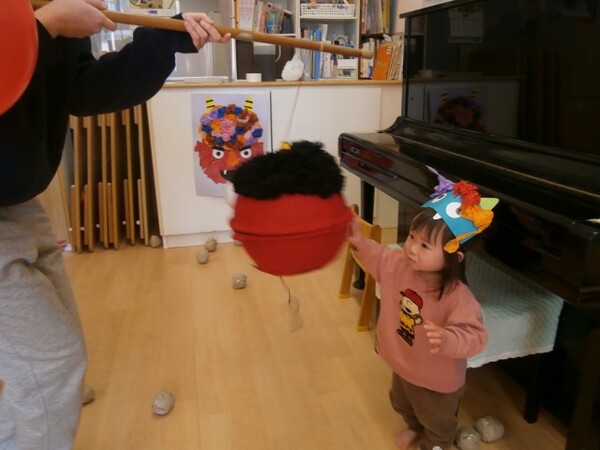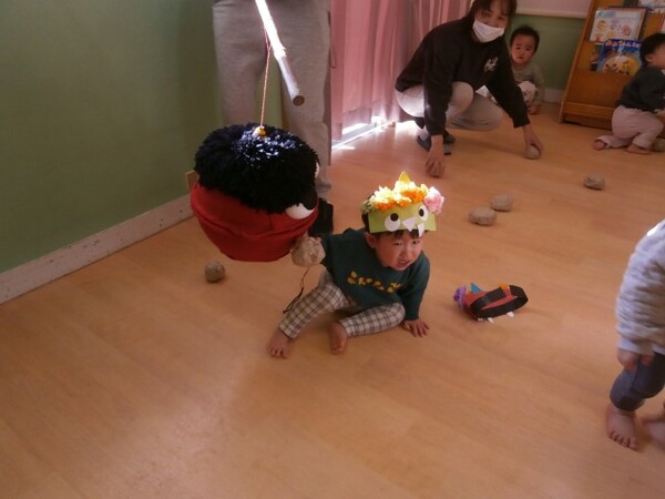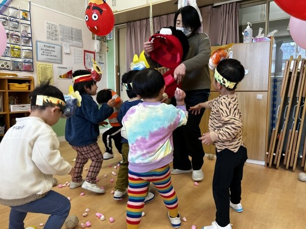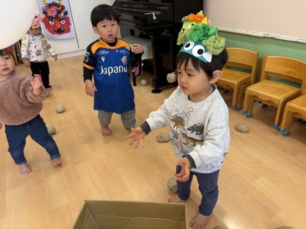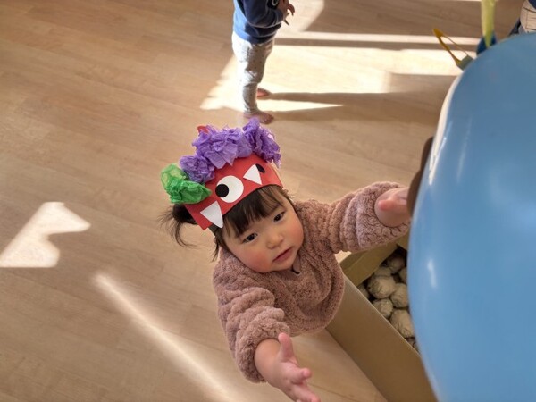 0・1歳児クラスのまめまきの様子です。