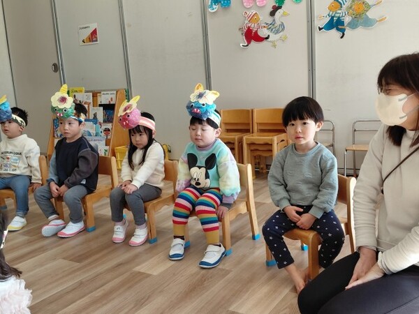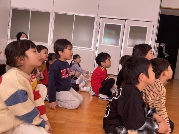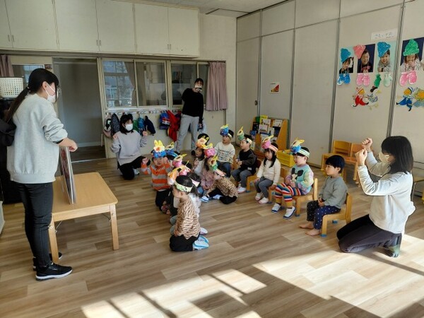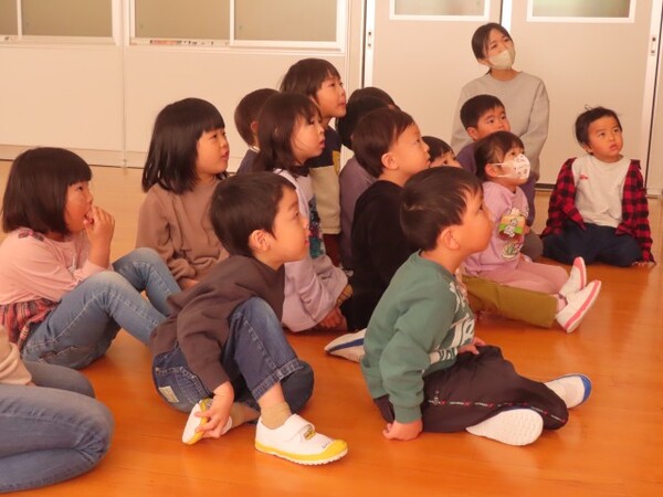 年少ぐみのまめまきの様子です。節分の話を聞いてから、まめまきのスタート!