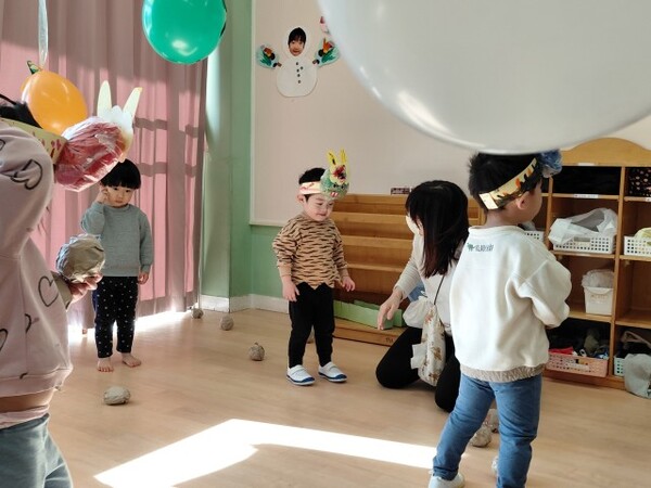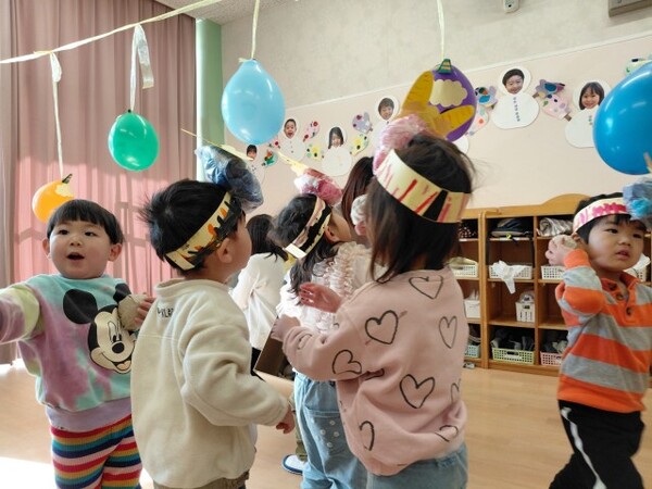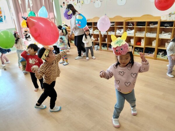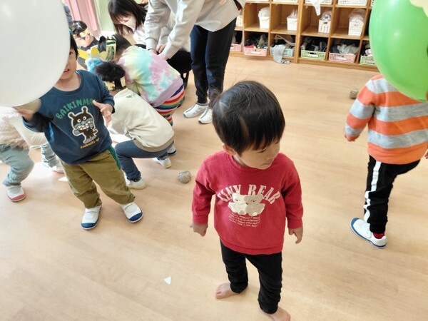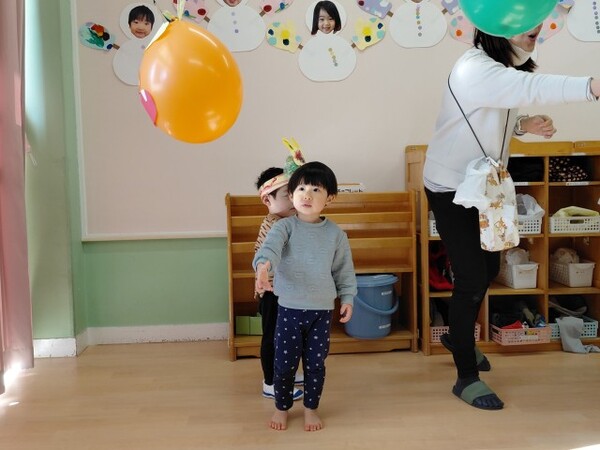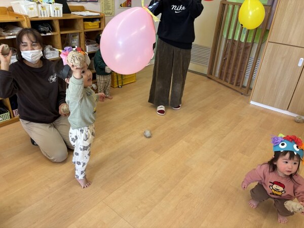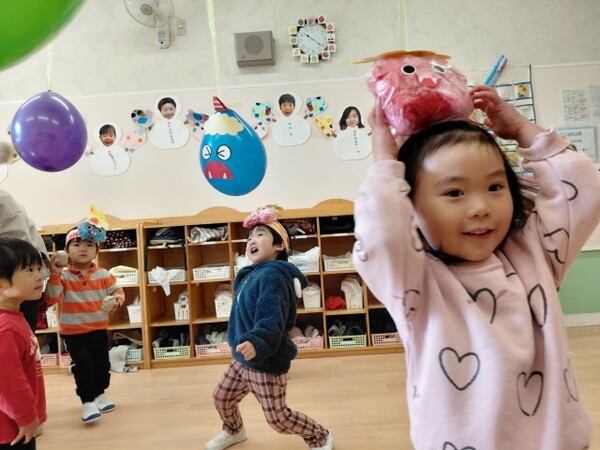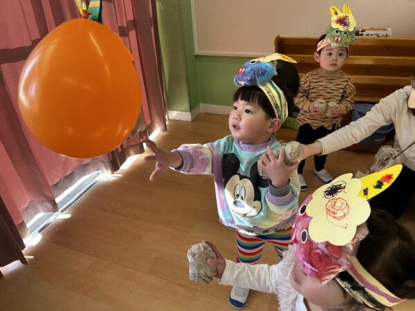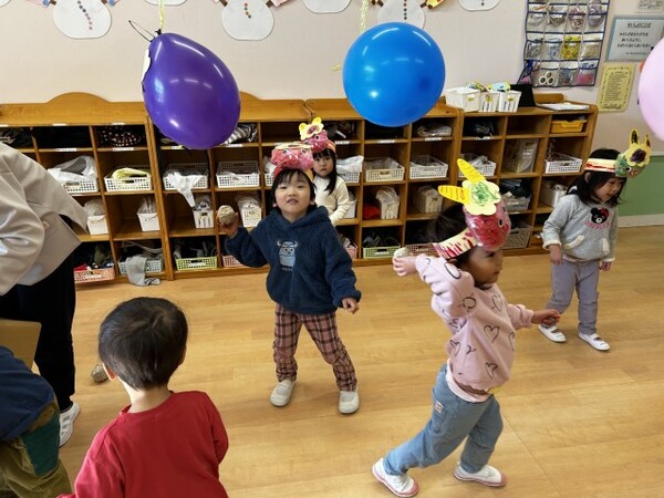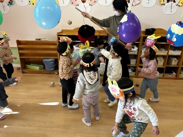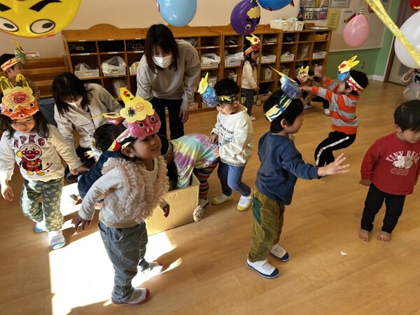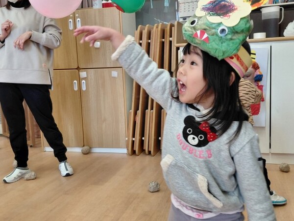 最後は、くす玉のオニにみんなでまめを投げました。たくさんまめが当たると、くす玉が割れてかわいいハートがたくさん出てきて大興奮の子どもたちでした。