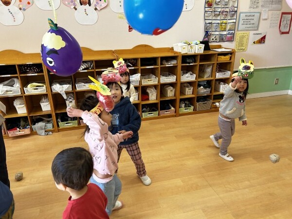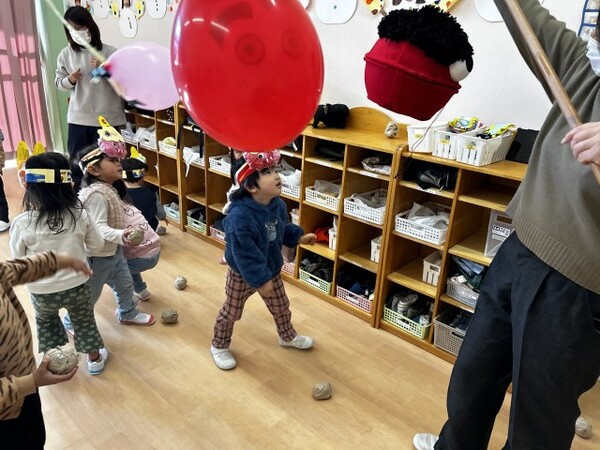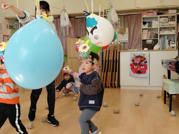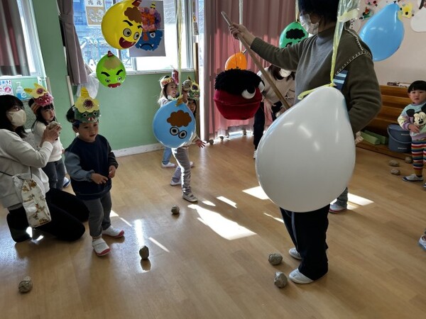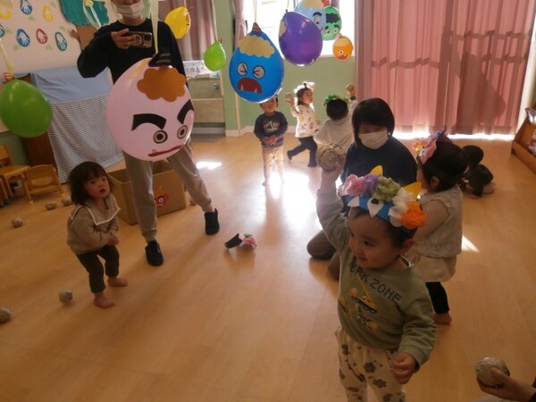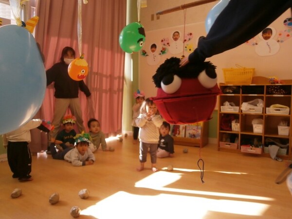 オニの風船めがけてまめまきをしました。