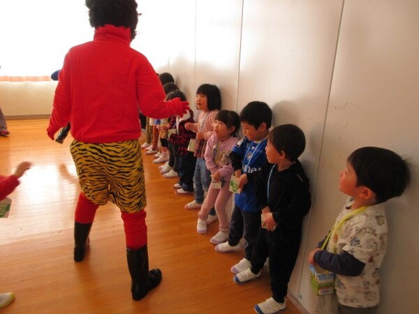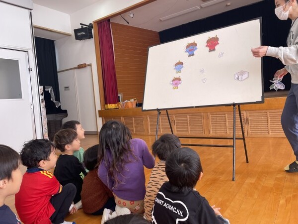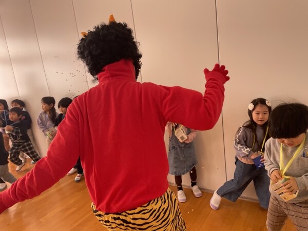 最初にまめまきのパネルシアターを見ました。その後、赤オニと青オニが登場して、みんなでまめをまいてオニを追い払いました。