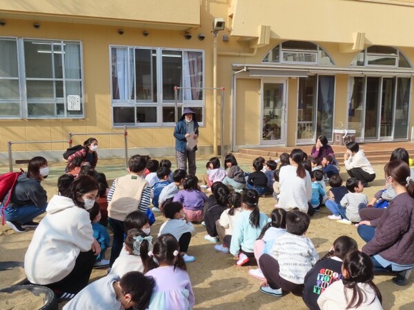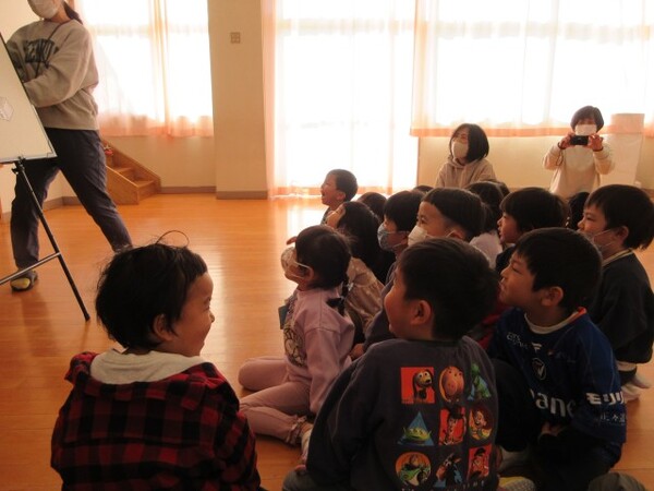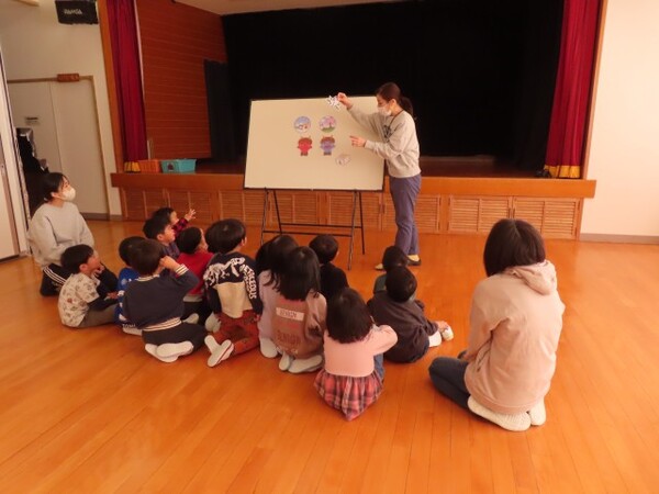 あおぐみとばらぐみで集まってまめまきの話を聞きました。