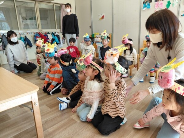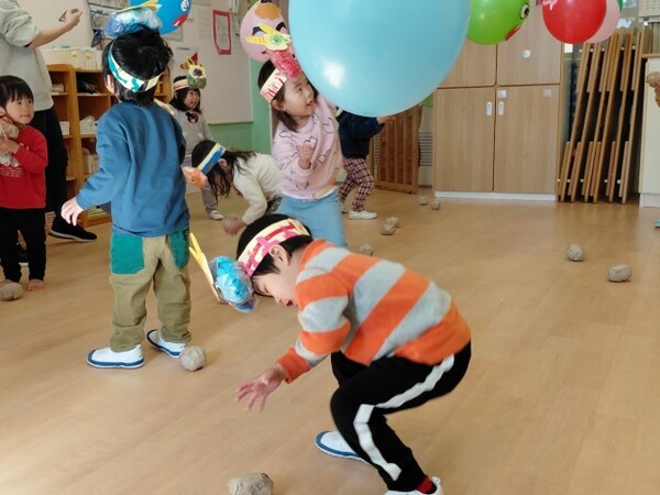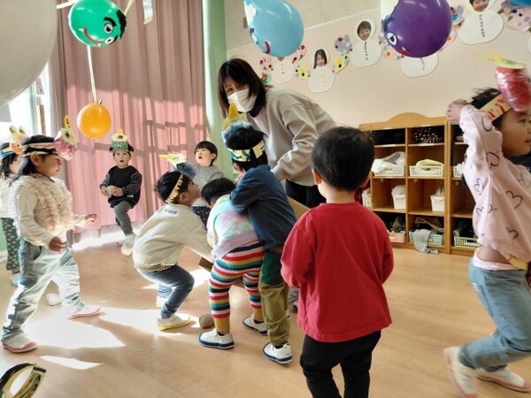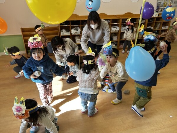 風船のオニをやっつけた後は、くす玉のオニの登場!びっくりする子が続出し、オニから思わず後ずさりする姿がたくさん見られました。最後は頑張ってオニを新聞で作ったまめで退治し、ホッとした様子の子どもたちでした。