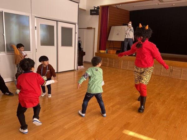 びっくりしたり、ドキドキしたりした子もいましたが、みんな必死にオニにまめを投げていました。