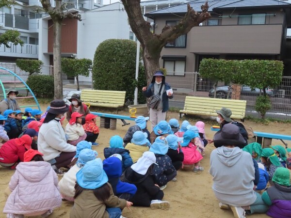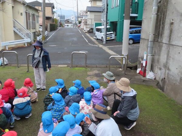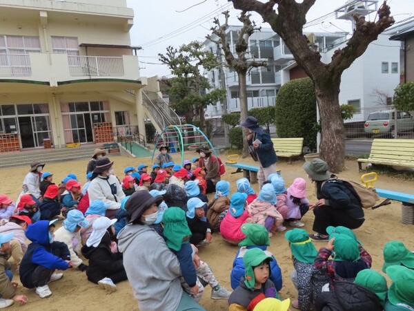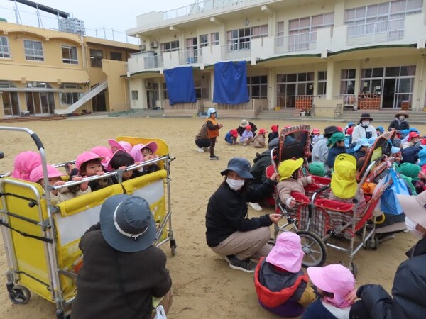 地震を想定した避難訓練を行いました。今回は、園庭に避難してから避難場所である富士見公園まで避難する訓練を行いました。