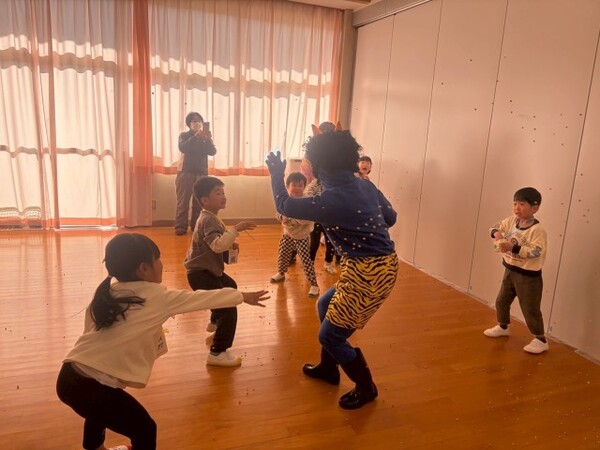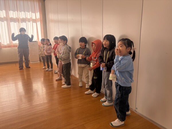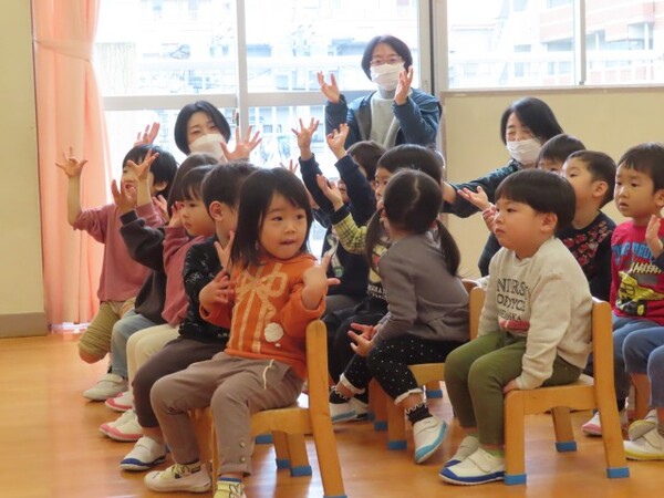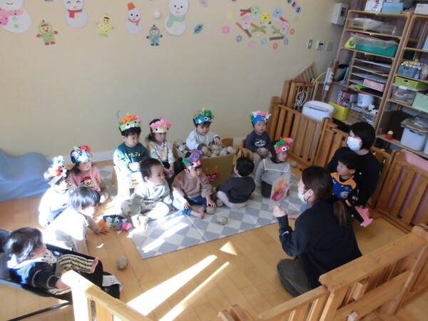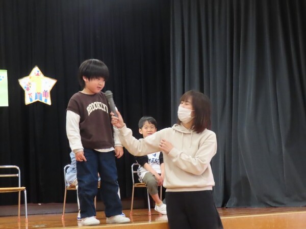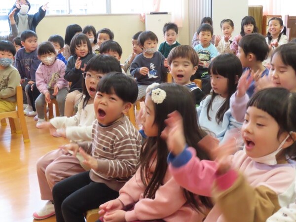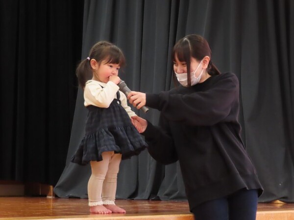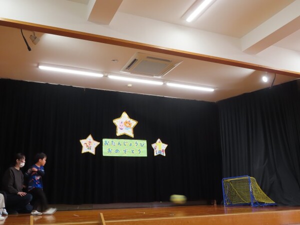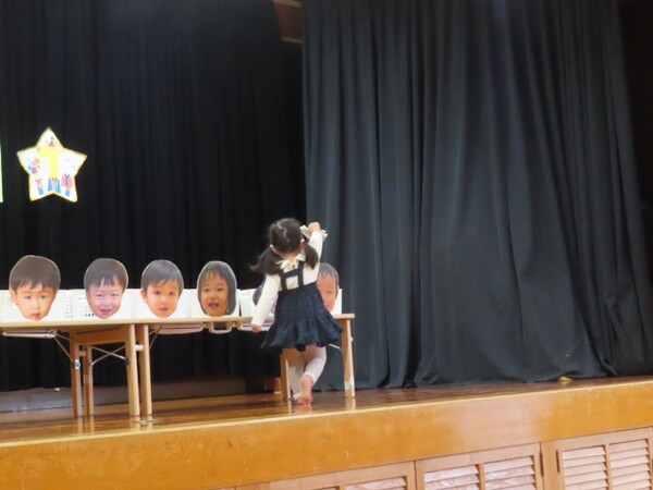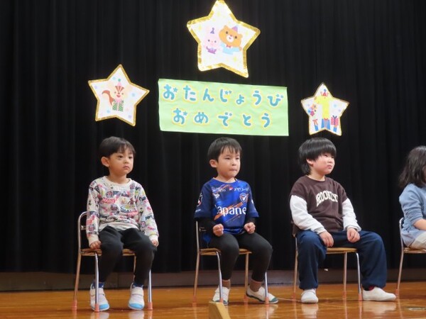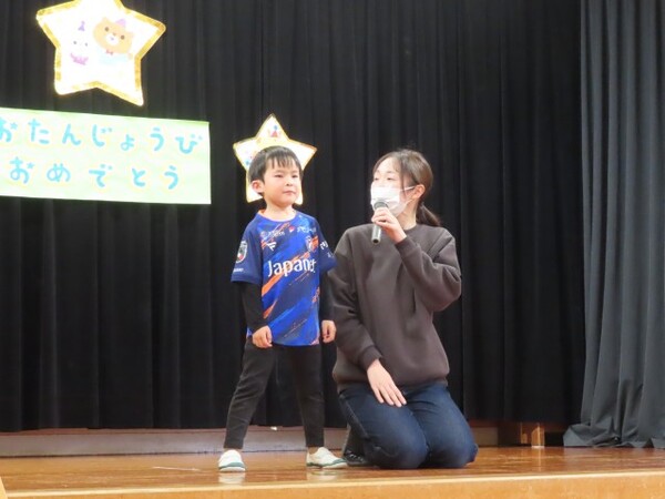 1・2月生まれの子どもたちの誕生会です。みんなでホールでお祝いしました。誕生児は名前と年齢のインタビューに元気に答えていました。