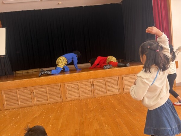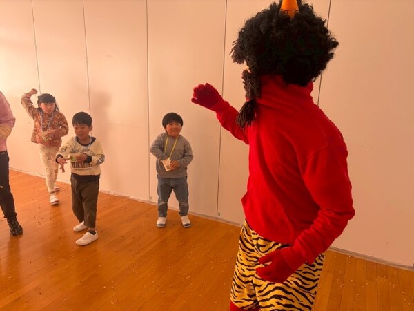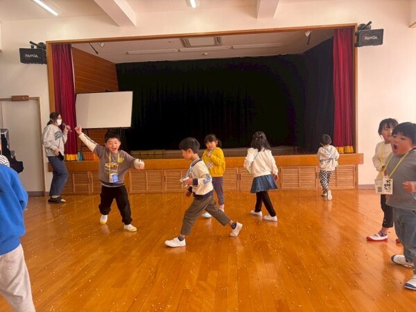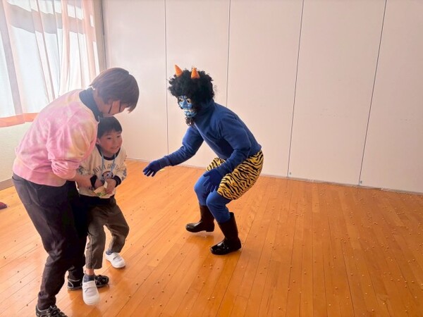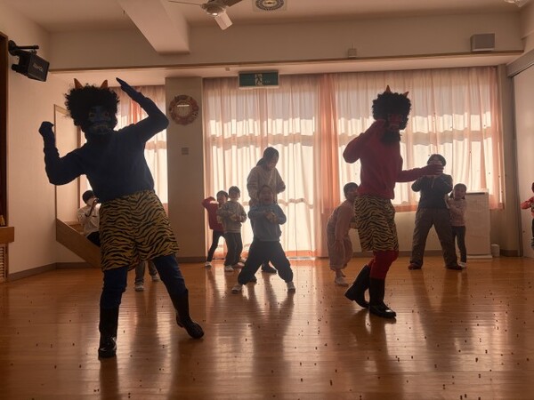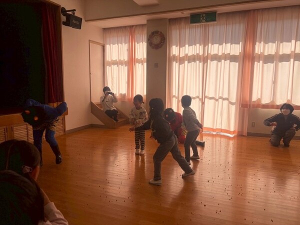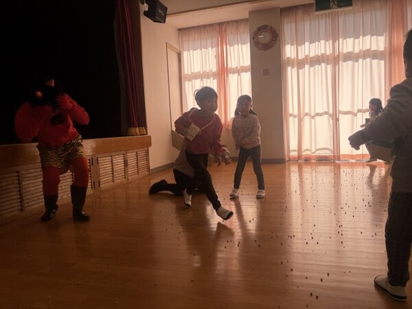 年長ぐみのまめまきの様子です。赤オニと青オニがあらわれて、みんなで豆を投げてオニを追い払いました。