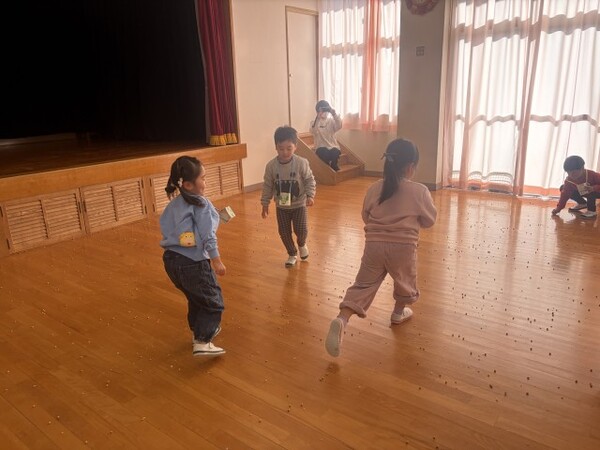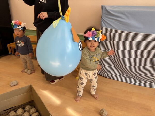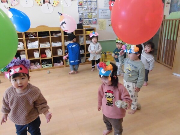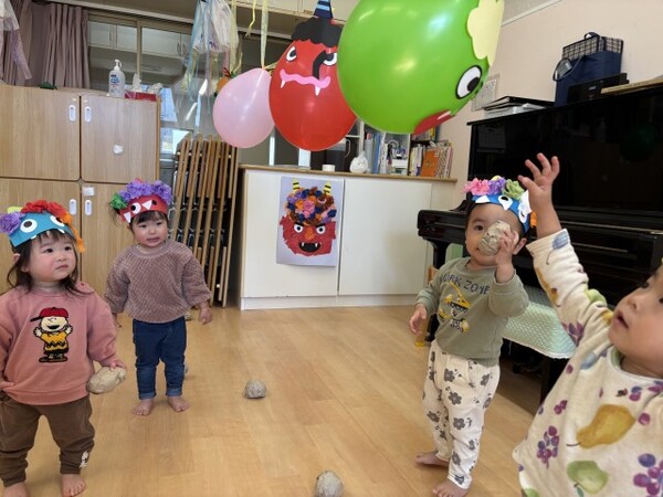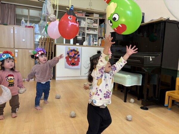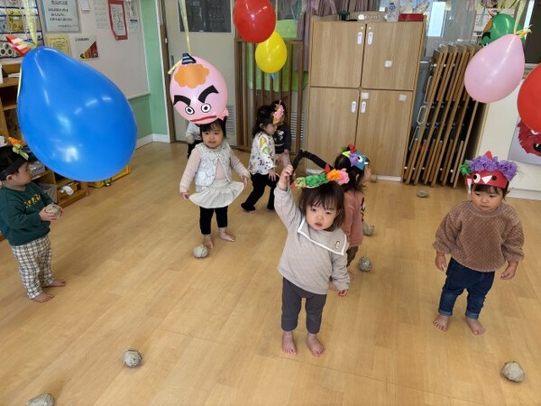 まめまきの話を聞いた後は、場所を移動してあおぐみの部屋でまめまきをしました。新聞紙で作ったまめでオニ(風船)を当てたり、ジャンプして触ったりしました。
