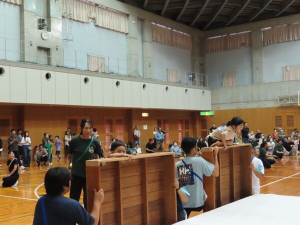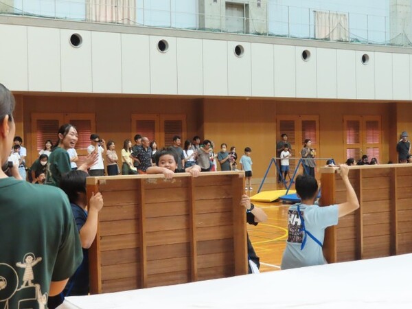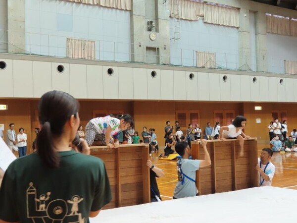 年長組の競技の様子です。友愛の毎年恒例の壁登り。勢いよく登る子、手と足の力を一生懸命使って登っていく子など子どもたちの頑張る姿をたくさん見ることができました。
