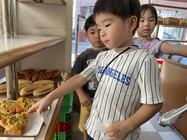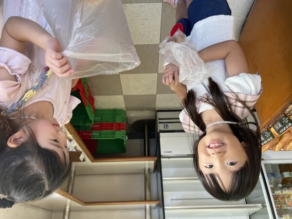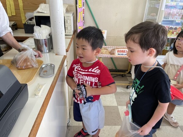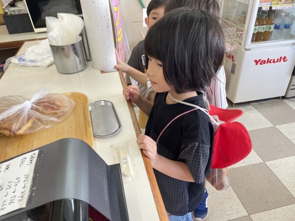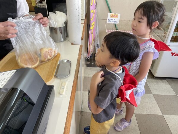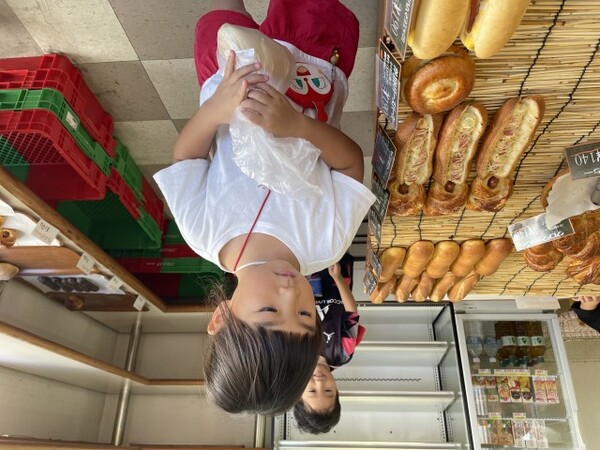 年中ぐみで園の近くのフランソアにパンのお買い物に行きました。それぞれパンを2個ずつ選びました。