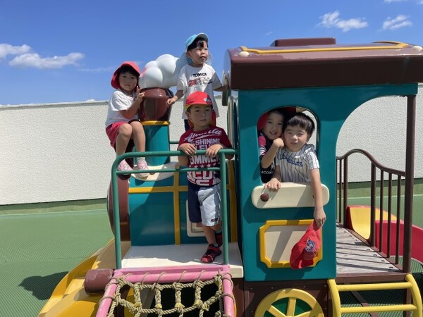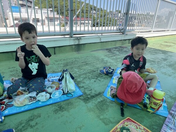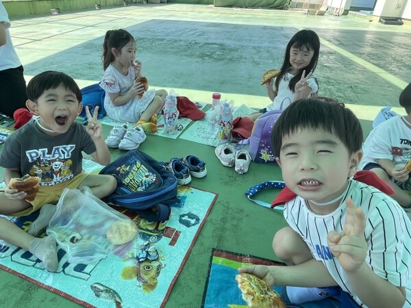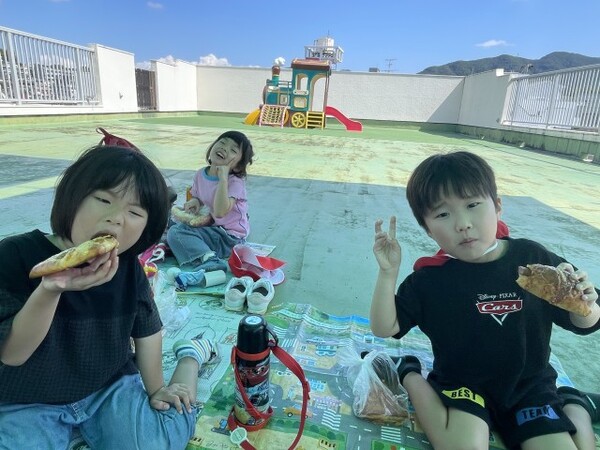 パンを買った後は、園の屋上で自分たちのシートを敷いて、ピクニック気分でいただきます♪ 食べたお友だちから屋上の遊具で遊びました。子どもたちにとって楽しみなパンのお買い物。「なににしようかな〜」「またいきたいな〜」と毎回楽しみにしている子どもたちです。