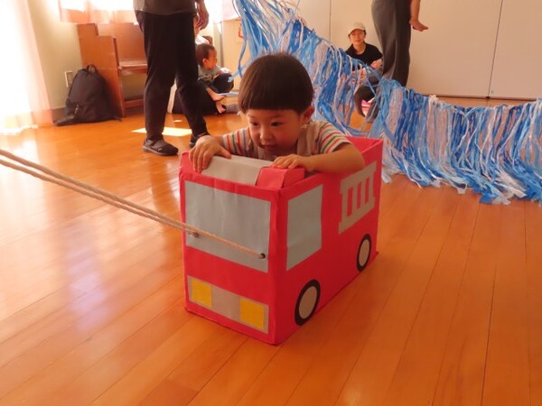 今日はミニミニ運動会。帽子をかぶってみんなかわいい消防士さんに変身し、消防車に乗って出動!!火のブロックを倒して無事に消火することができました。